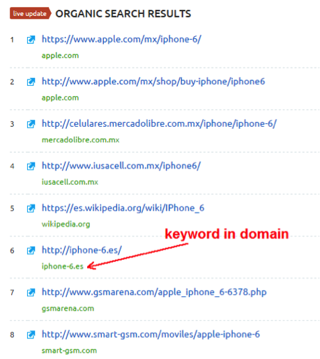 Here is an example of a search for “iPhone 6” performed in Mexico. The majority of results do not have the actual keyword “iPhone 6” in the domain name. The website iphone-6.es was actually outranked by stronger, more authoritative websites.