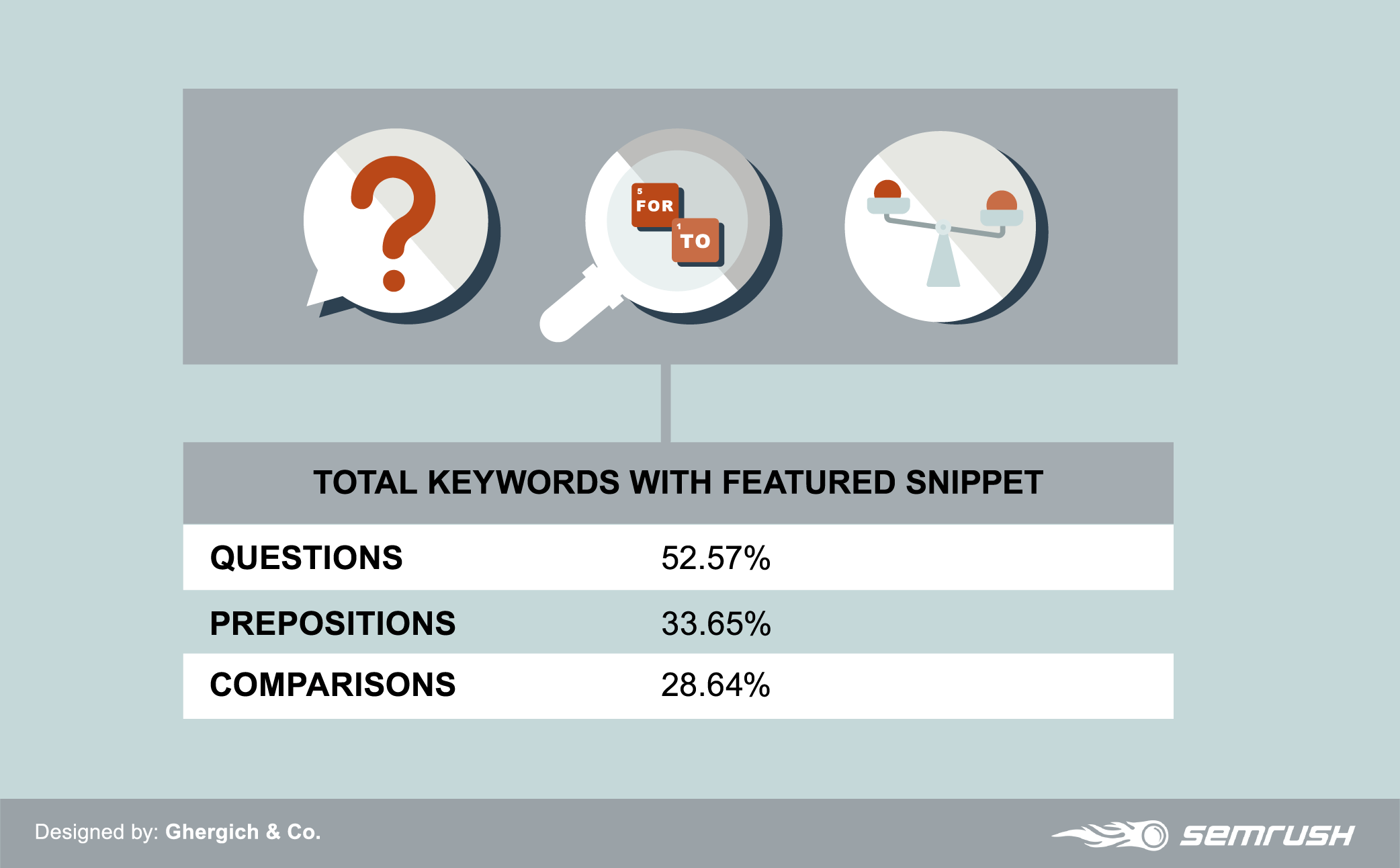 3. Questions, prepositions, and comparisons dominate featured snippet results. A whopping 52.57% of questions have featured snippets. If you remove questions, prepositions, and comparison keywords, the featured snippet total plummets. The remaining 82% of keywords only accounted for 5.90% of featured snippets.